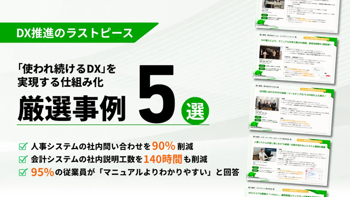 社内問い合わせ90%削減、差し戻し47%削減、システム説明会の工数を50%削減など、情シス・DX推進・管理部門の”社内システム”における課題を解決したDAPツール「Fullstar(フルスタ)」事例をまとめました。