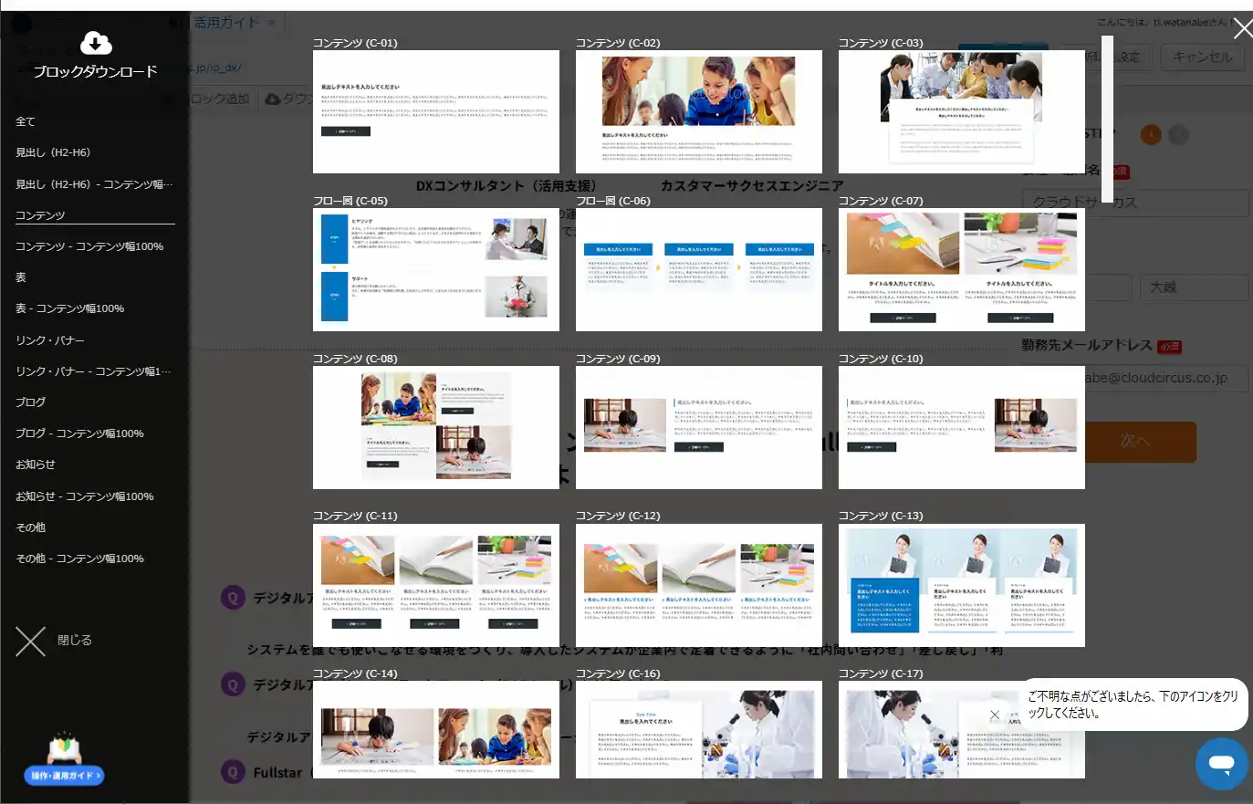 実際にWeb制作管理ができるCMSツール「Bluemonkey」では、Webサイトのブロック単位でテンプレートが用意されており、こちらを挿入、テキストや画像を登録・編集するだけでWebサイトの制作が可能になっています。