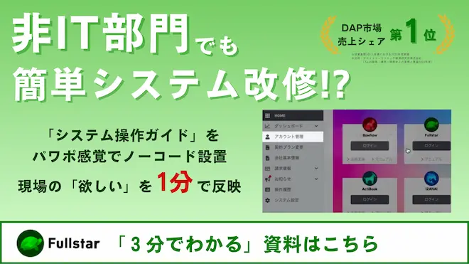 もし導入したツールの定着や操作習熟に課題がある場合は、デジタルアダプションプラットフォームを活用するのも一つの手です。デジタルアダプションとは、新しい技術やツールを導入し、従業員が日常業務で効果的に活用できるようにすることを指します。「Fullstar」のようなツールを使えば、画面上に直接操作ガイドを表示できるため、操作ミスや不要な問い合わせを減らし、誰でも使える環境を整備することが可能です。