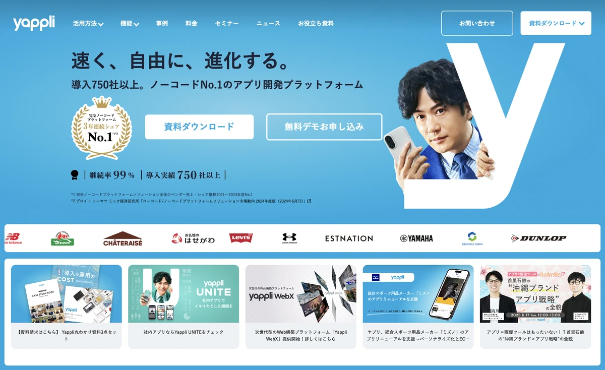 「Yappli(ヤプリ)」は、スマートフォン向けアプリの開発に特化した国産ノーコードツールです。直感的な操作でアプリを構築できるほか、運用やデータ分析も一元的に行える点が大きな魅力。Android・iOSの両方に対応しています。