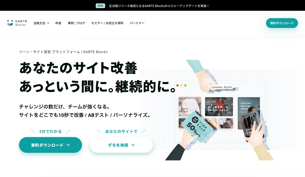 KARTEは、既存サイトにタグを1行追加するだけで導入できるノーコード型のWeb改善ツールです。ブロック単位での効果測定やABテスト、パーソナライズ配信が可能で、ユーザー行動に応じた柔軟なデザイン変更やUI改善が簡単に行えます。