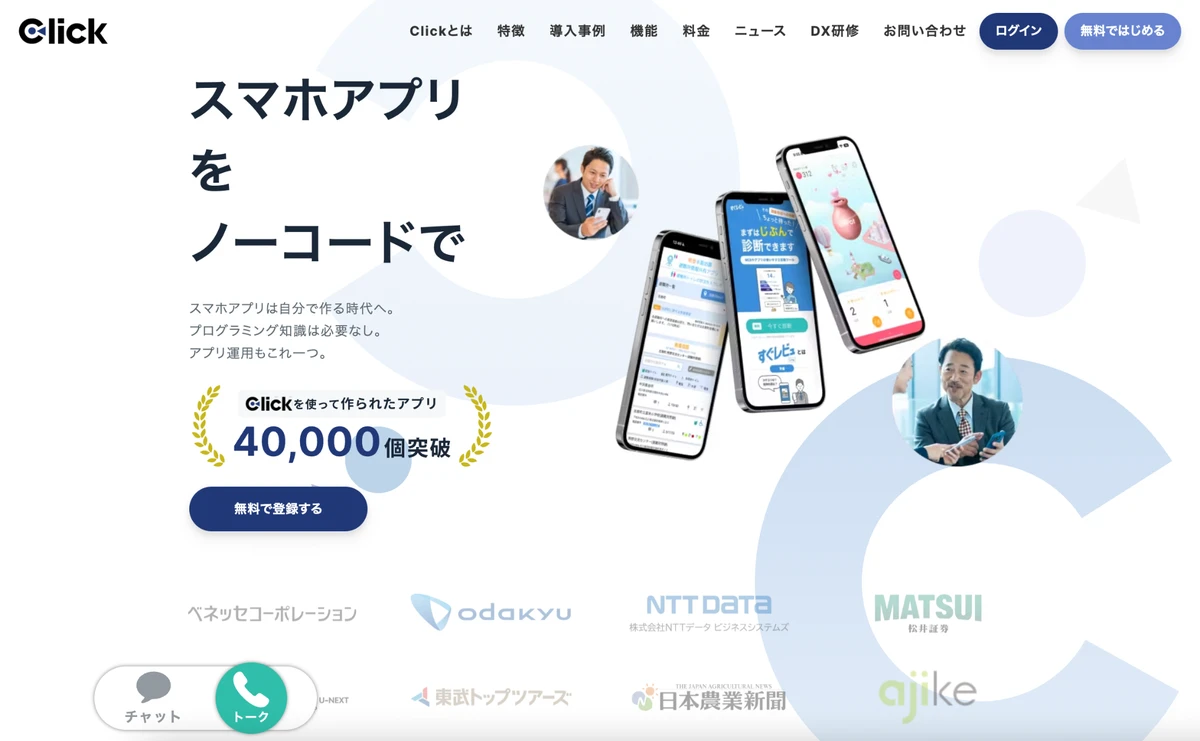 「Click」は、日本製の汎用型ノーコードツールで、スマホアプリやWebアプリを簡単に開発できるノーコードツールです。地図、チャット、検索、決済などの基本機能が揃っており、SNSやEC、業務アプリまで幅広く対応しています。