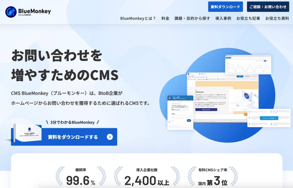 Bluemonkey | Webサイト制作(CMS) | 月額5万~ | 〇 | BtoB向け。 サポートが手厚い。 |