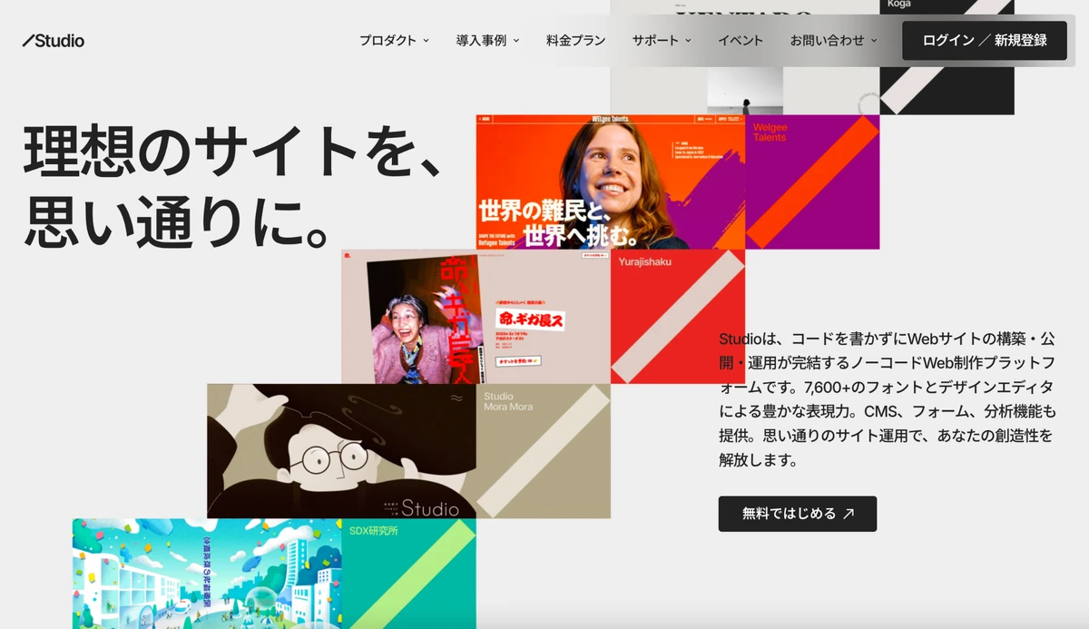 STUDIOは、コーディング不要で美しいWebサイトを直感的に作成できる国産ノーコードツールです。デザイン性の高いテンプレートや自由度の高いエディタを備え、企業サイトからECサイト、イベントページまで幅広く対応しています。